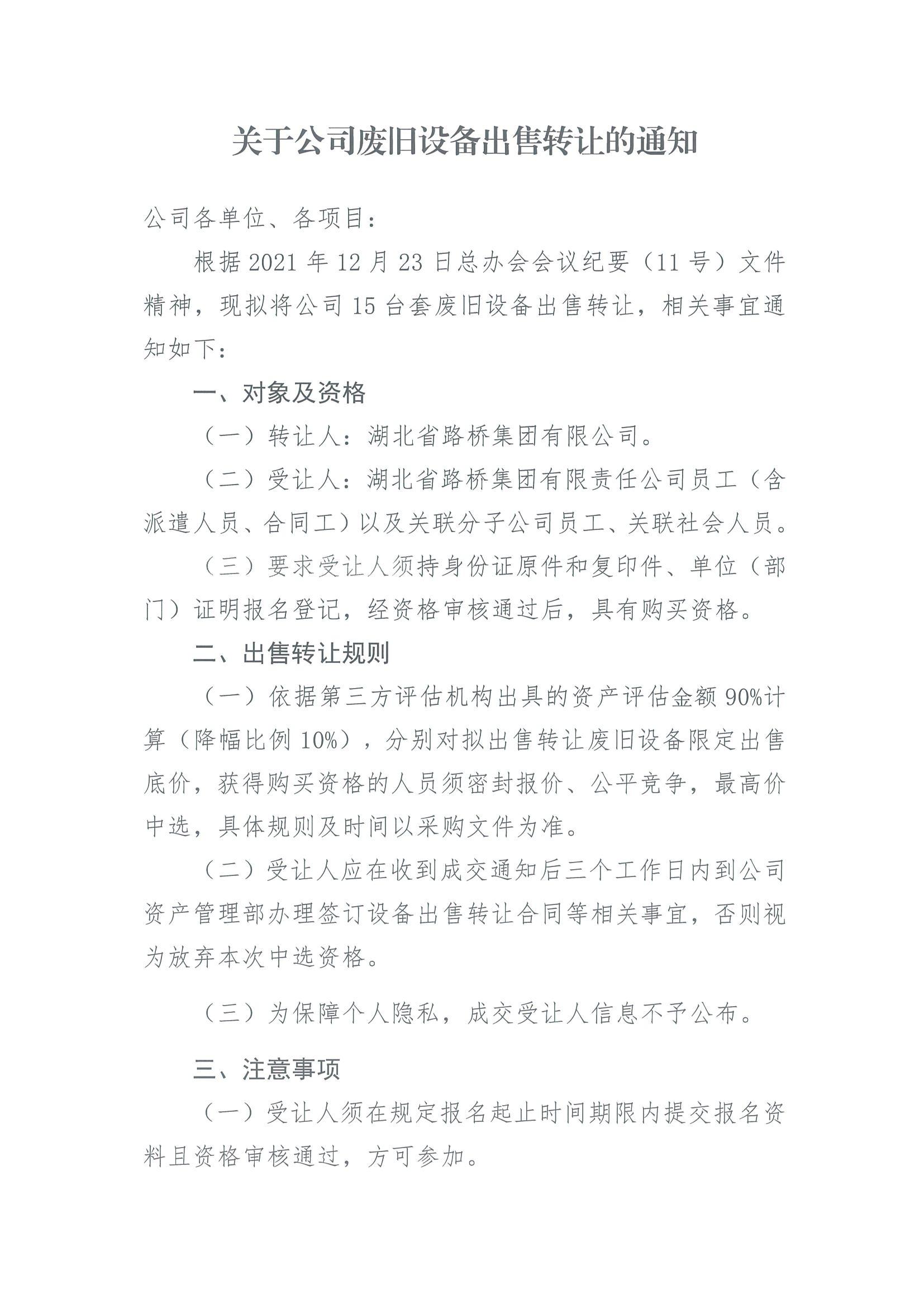 關于公司廢舊設備出售轉讓的通知