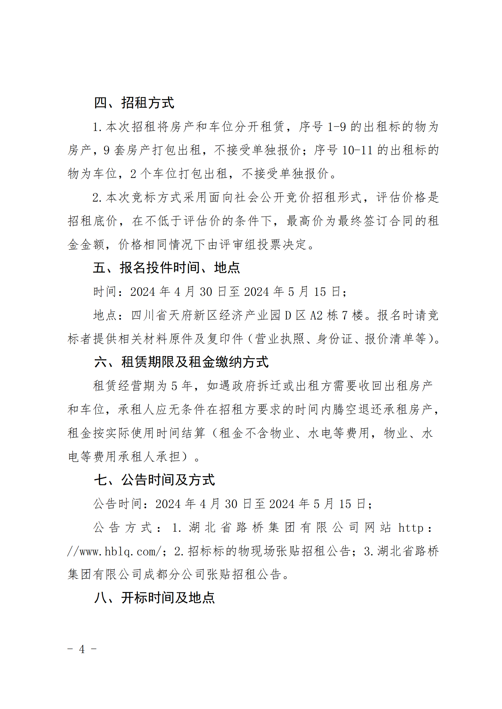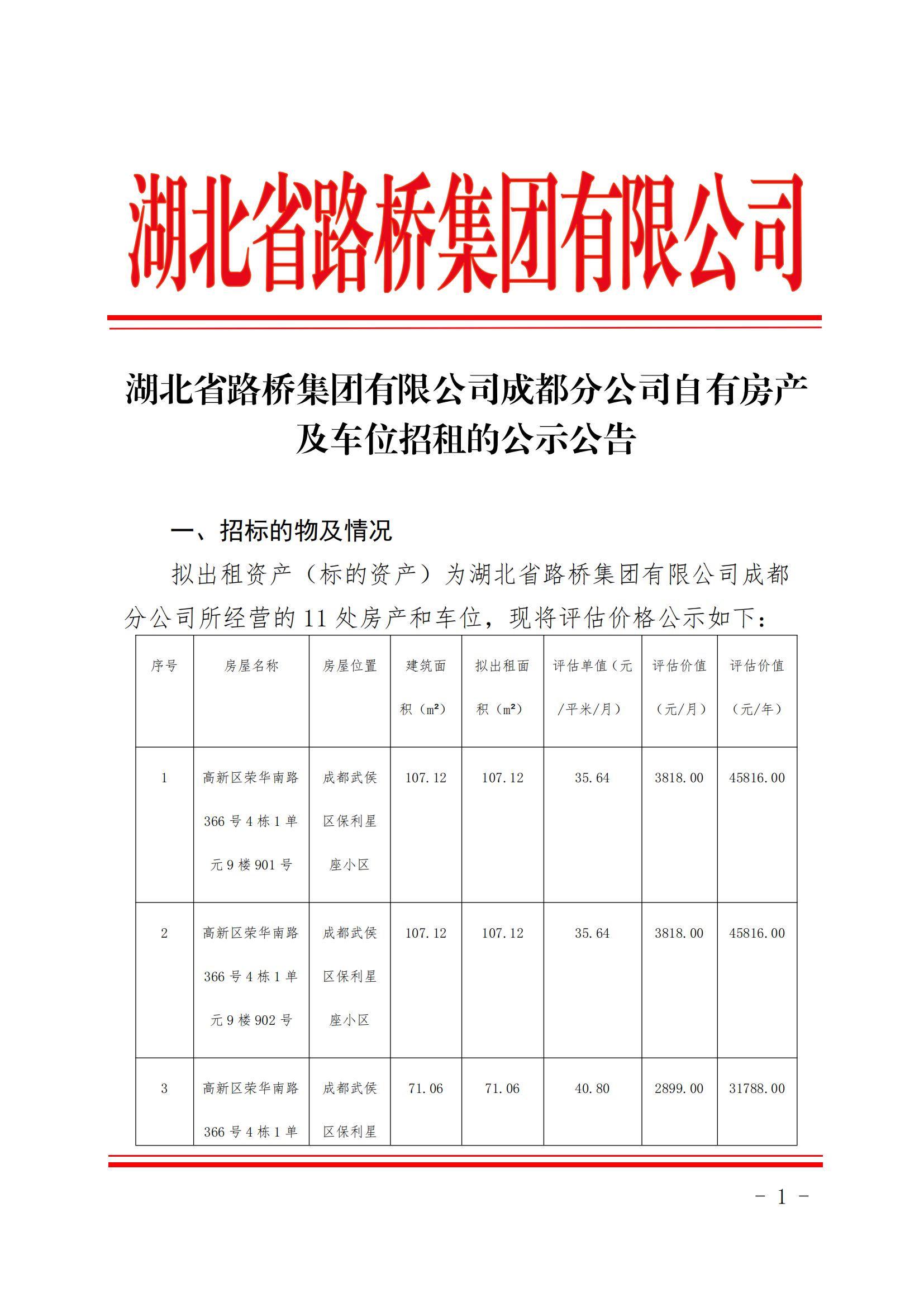 湖北省路橋集團有限公司成都分公司自有房產(chǎn)及車位招租的公示公告