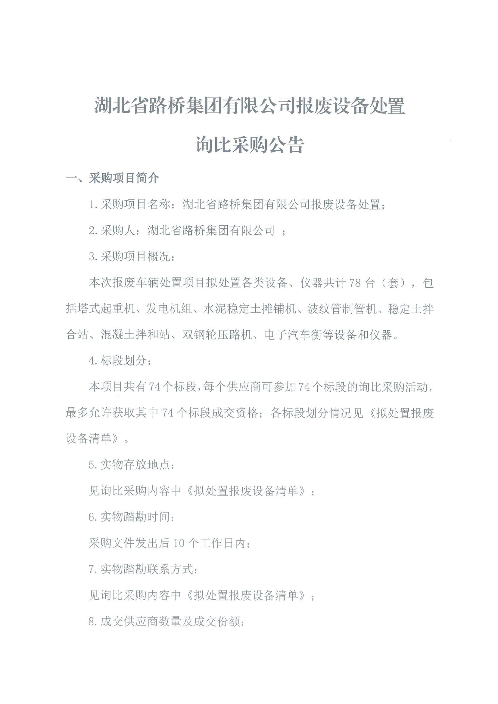 湖北省路橋集團(tuán)有限公司報(bào)廢設(shè)備處置詢比采購(gòu)公告
